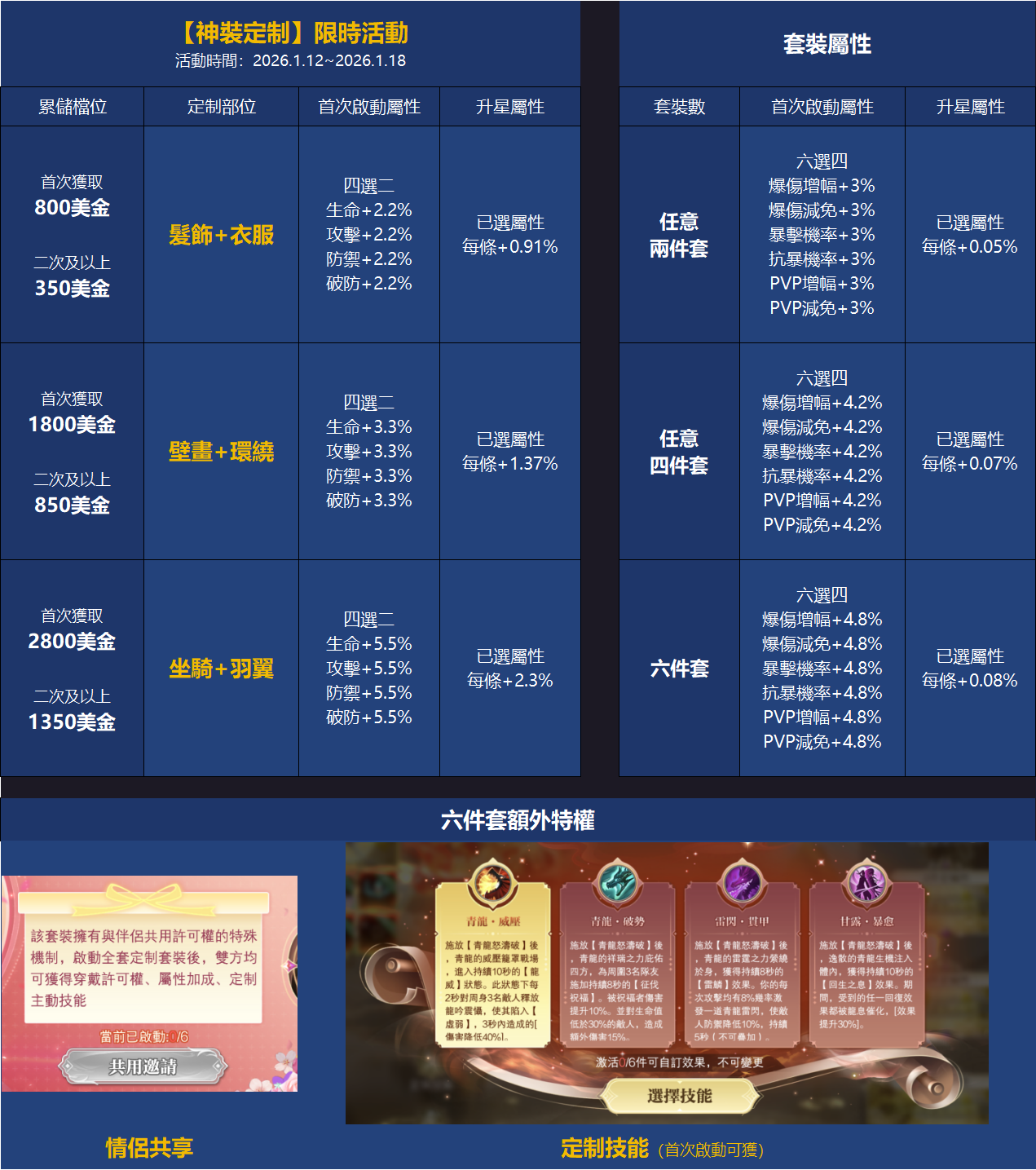 - 非首次參與,但沒收集滿全套神裝:假設之前只獲得過【衣服+髮飾】檔位,則本次活動儲值350美金即可再次申請【衣服+髮飾】。其他檔位,如【壁畫+環繞】,仍需按首次檔位,儲值滿1800美金獲取。